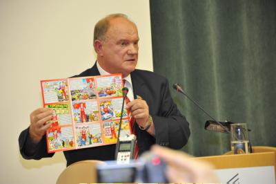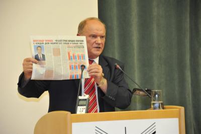 Лидер КПРФ отметил, что кризисы – неизбежные спутники капитализма. История знает уже двенадцать таких кризисов, причем два из них закончились мировыми войнами. Нынешний финансовый крах мог наступить на десять лет раньше, если бы мировая капиталистическая система не поддержала себя соками убитой Советской страны. Однако то, что должно было произойти, произошло: либерально-спекулятивный капитализм полностью изжил себя. Именно за констатацию этого факта пострадал, в частности, бывший глава МВФ Доминик Стросс-Кан. Сегодня Саркози и Меркель пытаются надеть намордник на своих олигархов, однако он все время соскакивает.