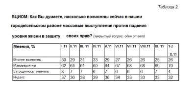 ВЦИОМ: Как Вы думаете, насколько возможны сейчас в нашем городе/сельском районе массовые выступления против падения уровня жизни в защиту своих прав? (закрытый вопрос, один ответ)