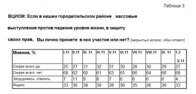 Примерно по той же концептуальной схеме строится мониторинг протестных настроений, осуществляемый Всероссийским центром изучения общественного мнения (http://wciom.ru/index.php?id=459&uid=112038). Как и в предыдущем исследовании, по данным, полученным 1-2 октября, здесь акцентируется факт падения протестного потенциала, причем как визуально оцениваемого, так и своих собственных желаний участвовать в вероятных акциях протеста (табл. 2-3). И так же, как и в предыдущем случае, этот пессимистический вывод может быть принят и разделен с аналогичными уже упомянутыми оговорками.