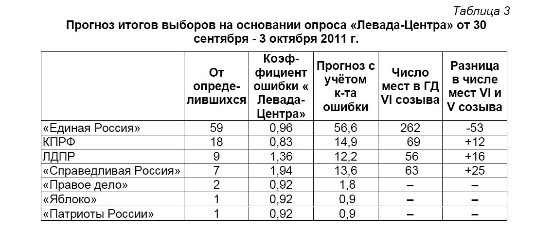 Прогноз итогов выборов на основании опроса «Левада-Центра» от 30 сентября - 3 октября 2011 г.