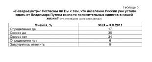 Есть и другие факторы, объективно сулящие оппозиции, в том числе и коммунистической, шансы на сохранение положительной электоральной динамики. В частности, за парадным фасадом высоких рейтингов первых лиц государства – лидеров партии власти, услужливо продвигаемых в общественное сознание разнообразными пропагандистскими официозами, скрываются куда как менее парадные и весьма прозаические вещи. Оказывается, как свидетельствуют данные «Левада-Центра» (табл. 4), существует проблема усталости населения России по части ожиданий от В. Путина каких-то положительных сдвигов в нашей жизни: этим настроениям усталости в разной степени подвержены свыше половины респондентов (52%) против меньшей половины (40%) эту усталость отрицающих. Иными словами, речь идет о харизме, до сих пор преподносимой как неоспоримая и неисчерпаемая, тем не менее заметно слабеющей буквально на глазах.