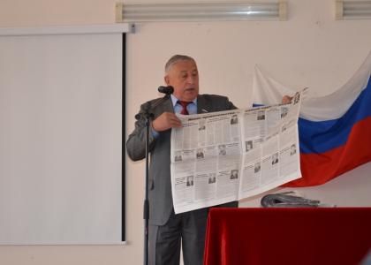 Н.М.Харитонов рассказал студентам и преподавателям вуза о своей трудовой и политической биографии, раскрыл некоторые особенности работы в российском парламенте и изложил основные принципы программы КПРФ, подходы партии к решению ключевых проблем развития российского общества. Он особо остановился на разрушительных последствиях приватизации и обосновал необходимость национализации – возвращения природных богатств, недр, энергетики и транспорта, металлургии и других базовых отраслей в собственность государства.