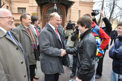 Г.А. Зюганов возложил цветы к памятнику В.И. Ленину, затем встретился с преподавателями и студентами в большом актовом зале университета. Представляя лидера КПРФ, ректор В.А. Таймазов подчеркнул, что Геннадий Андреевич является «нашим коллегой», поскольку начинал свою трудовую биографию учителем в сельской школе, где ему пришлось преподавать математику, физическое воспитание, труд и начальную военную подготовку.
