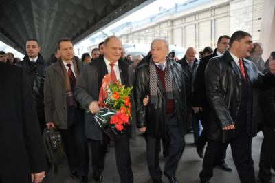 Утром на Московском вокзале Санкт-Петербурга лидера КПРФ торжественно встретили коммунисты и комсомольцы.