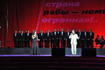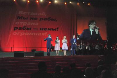 Громкими аплодисментами зрительный зал приветствовал всенародно любимых артистов Николая Губенко и Жанну Болотову. Николай Губенко прочел стихи на военную тему, а Жанна Болотова сказала, что она гордится тем, что родилась в Советском Союзе и очень надеется, что это счастливое время еще вернется.