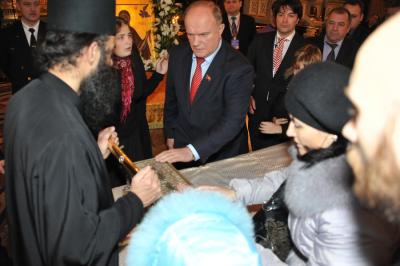 По милости Божией и при упорной работе коммунистов по возрождению России соборно со всем народом нашей страны можно будет отодвинуть сползание нашей Родины в пучину кризиса и беззаконий. За это молются все православные граждане страны и призывают силы небесные помочь народу завершить 20-летний цикл бессмысленных и потерянных лет. И принесение с Афона этой святыни - пояса Божией Материи - знак не случайный. Поэтому, получив благодать от этой православной реликвии, Геннадий Зюганов как лидер крупнейшей оппозиционной партии страны - партии всего народа - готов с верой и решительно завершить предвыборную кампанию КПРФ и выполнить предвыборные обещания партии, всех народно-патриотических сил перед избирателями, гражданами страны.