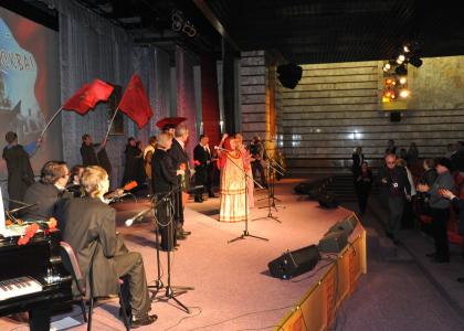 Затем состоялся праздничный концерт, который представлял собой скорее театрализованное музыкальное представление. Оно воссоздавало настроения людей и обстановку с момента трагического начала Великой Отечественной войны, когда немцы оттесняли наши войска все дальше на восток, вплоть до битвы под Москвой, когда советские солдаты погнали их обратно.