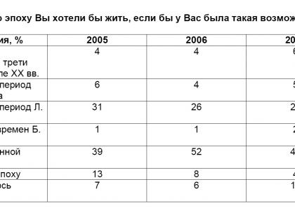 Первый вопрос исследования ставит своей целью выявления рейтинга исторических периодов, максимально приемлемых для жизни современного человека (табл. 1). Первенствует, естественно, наше время, люди в значительном своем большинстве (47%) предпочитают жить в том времени, в котором они родились, отвергая идеи сомнительно утопических путешествий на «машине времени». Есть, однако, и те, кто перед подобными соблазнами ближних и дальних путешествий в историческом времени устоять не может, выбирая в качестве такой предпочтительной пространственно-временной реальности СССР периода Л. Брежнева (24%). Заклейменный в свое время как «эпоха застоя» со всеми подобающими случаю уничижительными эпитетами этот период не слишком отпугивает его гипотетических визитеров, готовых в нем даже поселиться. Такого рода поведенческие мотивации обусловлены сознанием несомненных исторических преимуществ, которыми был наделен тот период отечественной истории и многие из которых оказались безвозвратно утрачены.