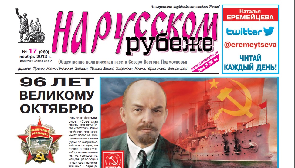 Вышел из печати очередной, 17-й, номер общественно-политической газеты Северо-Востока Подмосковья «На русском рубеже». Как всегда, в газете много материалов по актуальным, острым темам, волнующим жителей Подмосковья и всей России. На первом месте - приближающаяся 96-я годовщина Великой Октябрьской социалистической революции, которую буржуазная власть пытается замолчать и опорочить. Пришедшие к власти контрреволюционеры скрывают от людей, что революция ознаменовала коренной поворот в жизни российского общества, в развитии мировой цивилизации. Долгосрочные интересы государства требуют, говорится в газете, чтобы к 7 ноября относились так, как событие того заслуживает. Так, например, как относятся к своей Великой Революции в цивилизованной Франции: каждый год 14 июля, в день взятия народом королевской тюрьмы Бастилии, в Париже проводится военный парад. В цивилизованной Франции давно поняли, что воля народа – превыше всего.