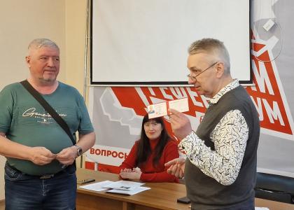 По традиции в самом начале политзанятия Валерий Алексеевич вручил значки и удостоверения вновь вступившим в организацию товарищам.