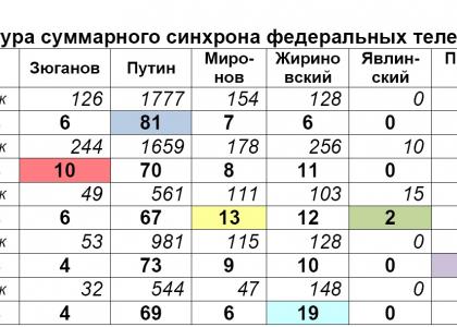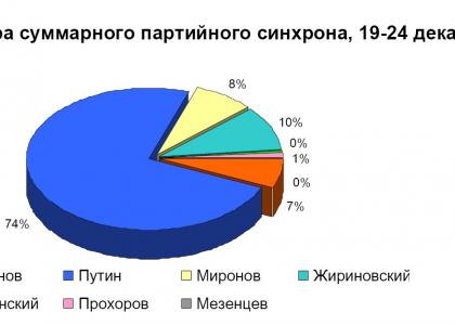 Что касается синхрона (прямой речи) партийцев, то его структура аналогична: Путину было предоставлено 74% суммарного времени, Жириновскому – 10%, Миронову – 8%. Г. Зюганову досталось 8 минут 24 секунды, или 7%, что в 11 раз меньше, чем В. Путину, в полтора раза меньше, чем В. Жириновскому и на 1% меньше, чем Миронову.