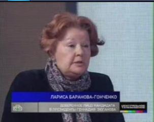 На телеканале НТВ решили устроить диспут деятелей культуры – доверенных лиц кандидатов в президенты. От Г.А.Зюганова на дискуссию была делегирована известный российский литературный критик, секретарь Союза писателей России Лариса Баранова-Гонченко. Но, как оказалось, целью устроителей передачи на НТВ была не дискуссия, а тестирование реакции представителей оппозиции на местечковое хамство ведущего НТВ.