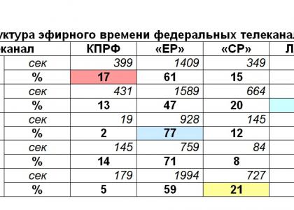 «Единой России» была предоставлена наибольшая доля телеэфира на НТВ и ТВЦ (77 и 71%). «Справедливая Россия» заняла максимум эфира Рен-ТВ и «России» (21 и 20%). ЛДПР отдал предпочтение телеканал «Россия» (20%).