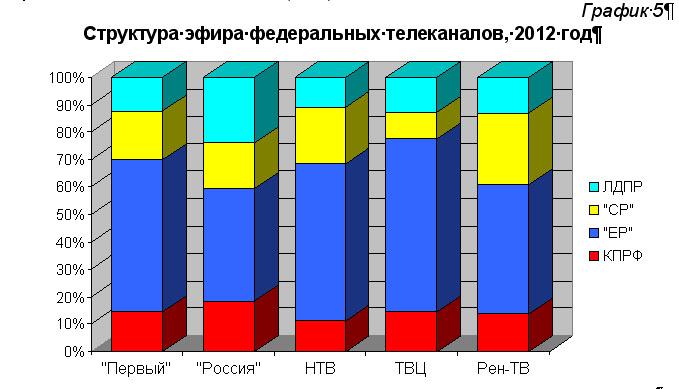 В 2012 году на пяти федеральных телеканалах четырём парламентским партиям было посвящено 169 часов 7 минут новостного партийного эфира, что на три часа меньше, чем в прошлом году. (Таблица 1).