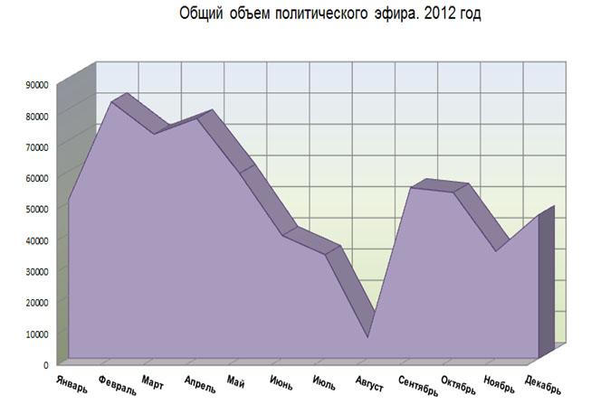 Основные точки политической активности в телеэфире пришлись на февраль, март и апрель, что было связано с Президентскими выборами. Наибольшего объёма политический эфир достиг в феврале, в преддверие Выборов Президента 4 марта. Начиная с мая, объём политического эфира постепенно падал.