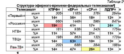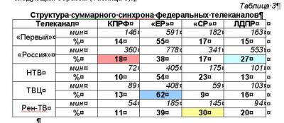 Из таблицы видно, что доля КПРФ возросла в разной степени, но на всех телеканалах. Выше всего данный рост на канале ТВЦ (с 6 до 14% по сравнению с предыдущим годом). Подобная ситуация и в прямой речи. КПРФ потеряла процент лишь в синхроне на Рен-ТВ (её доля упала с 13 до 11%).