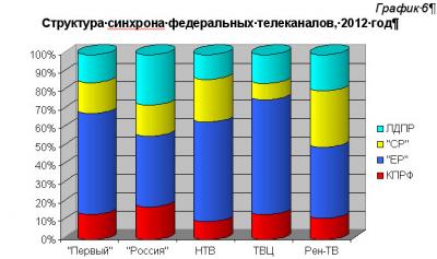 Единороссы получили наибольшую долю синхрона на ТВЦ, «Первом» и НТВ (62, 55 и 54%). Предпочтение справороссам отдали Рен-ТВ и НТВ (30 и 23%). Либерал-демократы заняли максимум эфира телеканалов «Россия» и Рен-ТВ (27 и 20%).