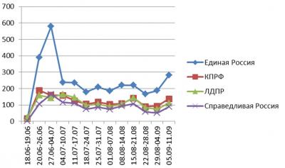 графика упоминаемости партий в интернет-сообщениях видно, что пик упоминаемости