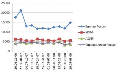 ЛДПР и «СР» практически повторяют друг друга, наибольший пик для этих партий