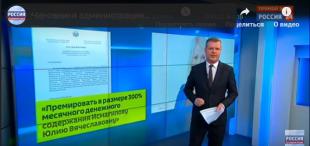 «Россия» 17 января показал два сюжета, занявшие 1 минуту 44 секунды (3% эфирного времени). В них телеканал сообщил о громком скандале с увольнением заместителя министра финансов Г. Спиридоновой губернатором Хакасии из-за её несогласия раздать премии некоторым представителям руководства Республики. Ещё один сюжет вышел 16 января на «России 24» и занял 5 минут 35 секунд или 8% эфира.