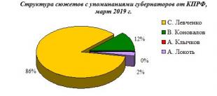 Таким образом, наибольшее число сообщений в марте было посвящено С. Левченко (35 сюжетов или 86%). В. Коновалов упоминался в пяти сообщениях (12%), А. Клычков – в одном (2%), А. Локоть в марте не упоминался (График 1).