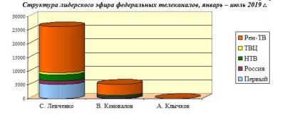 Рассмотрим, как распределялось эфирное время С. Левченко на ведущих телеканалах: «Первом», «России», НТВ, ТВЦ и Рен-ТВ в период с января по июль 2019 г. (Табл.4)