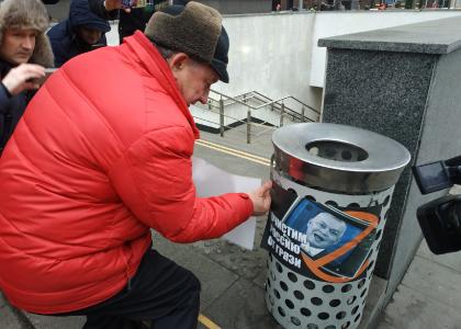 акции наклеили на урны и мусорные баки в центре Москвы наклейки с фотографиями Соловьёва,