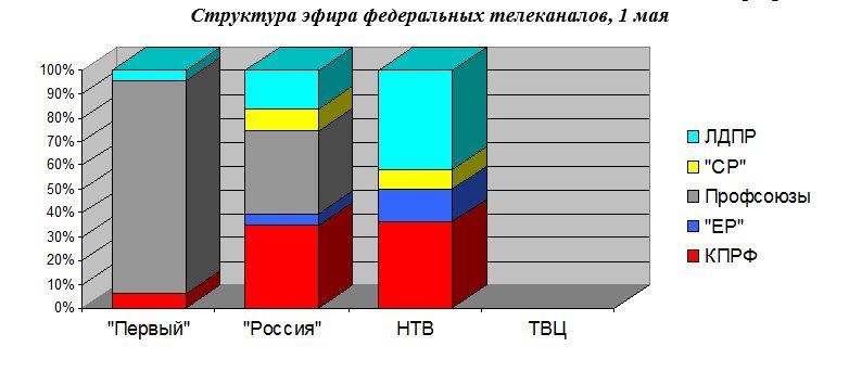 Большую часть сюжета «Первого» канала занимало освещение митинга Профсоюзов, «Россия» одновременно рассматривал мероприятия разных партий, а НТВ только четырех парламентских партий. При освещении партийных маёвок «Первый» и «Россия» отдали предпочтение Коммунистам, НТВ – либерал-демократам.