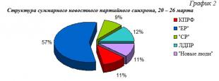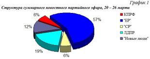 Что касается синхрона (прямой речи) партийцев, то его структура аналогична: единороссам было предоставлено 57% новостного синхрона, 12% либерал-демократам, 9% справороссам и 11% «Новым людям».