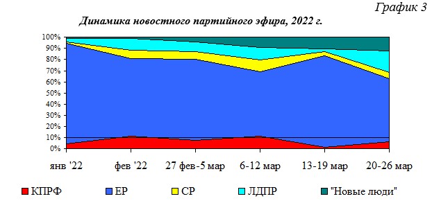 В течение 2022 г. структура новостного партийного телеэфира менялась следующим образом (Гр.3):