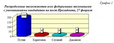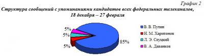 Как видим (гр.2), если анализировать информационную ситуацию с начала заявительно-регистрационной фазы кампании с 18 декабря по 27 февраля - 85% всех телесюжетов посвящены В.В.Путину и по 5% - Н.М.Харитонову, Л.Э.Слуцкому и В.А.Даванкову.