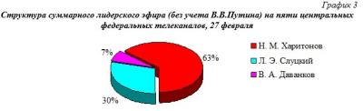 Анализ ситуации в федеральном телеэфире 27 февраля показал, что среди соперников В.В.Путина наибольший объем эфира за анализируемые сутки на федеральных каналах получил Н.М.Харитонов – 63% эфира без учета В.В.Путина, далее Л.Э.Слуцкий – 30% эфира и В.А.Даванков – 7% (табл.3, гр.3).