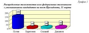 Как видно из гр.1, 11 марта в информационно-политическом эфире было полное доминирование действующего президента/кандидата в президенты В.В.Путина (152 телесюжета на всех федеральных телеканалах). Это 76,4% от общего количества сюжетов с упоминанием кандидатов в президенты. Кандидат от КПРФ Н.М.Харитонов был упомянут в 15 сюжетах (7,5%). Лидер ЛДПР Л.Э.Слуцкий упоминался 16 раз (8%). Представитель «Новых людей» В.А.Даванков также был отмечен в 16 сюжетах (8%).