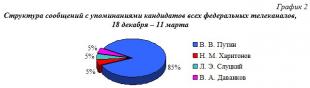 Динамика представленности кандидатов в президенты в федеральных новостных и информационных сюжетах с 18 декабря 2023 года по 11 марта 2024 г. а также совокупный результат за этот период даны в табл.1. и на гр.2