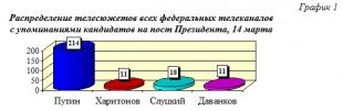 Как видно из гр.1, 14 марта в информационно-политическом эфире было полное доминирование действующего президента/кандидата в президенты В.В.Путина (214 телесюжетов на всех федеральных телеканалах). Это 84,3% от общего количества сюжетов с упоминанием кандидатов в президенты. Кандидат от КПРФ Н.М.Харитонов был упомянут в 11 сюжетах (4,3%). Кандидат от ЛДПР Л.Э.Слуцкий упоминался 18 раз (7,1%). Представитель «Новых людей» В.А.Даванков был отмечен в 11 сюжетах (4,3%).
