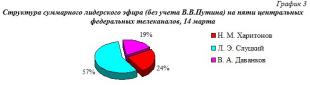 Анализ ситуации в федеральном телеэфире пяти центральных федеральных телеканалов 14 марта показал, что среди соперников В.В.Путина наибольший объем эфира за анализируемые сутки на федеральных каналах получил Л.Э.Слуцкий – 57% эфира без учета В.В.Путина, далее Н.М.Харитонов – 24% эфира и В.А.Даванков – 19% телеэфира (табл.5, гр.3).