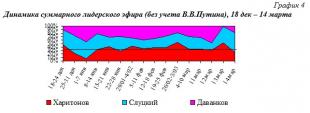 Динамика и структура суммарного лидерского телеэфира без учёта представленности В.В. Путина, 18 декабря – 14 марта представлена на гр.4 и на гр.5.