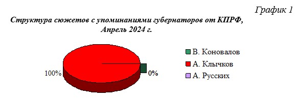 Сотрудниками сектора была проанализирована упоминаемость трёх губернаторов от КПРФ: А. Клычков (губернатор Орловской области), В. Коновалов (губернатор Хакасии) и А. Русских (губернатор Ульяновской области) (Табл.1)