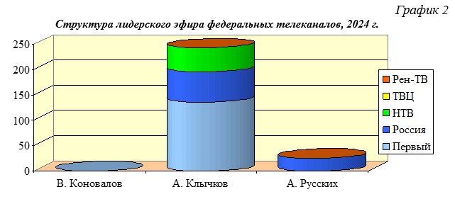 В первой десятке лидеров по числу сюжетов с упоминаниями в информационно-политическом эфире федеральных телеканалов в период с января по апрель 2024 г. оказались: Собянин Сергей Семенович (Москва), Гладков Вячеслав Владимирович (Белгородская обл.), Воробьев Андрей Юрьевич (Московская обл), Пушилин Денис Владимирович (ДНР), Паслер Денис Владимирович (Оренбургская обл.), Моор Александр Викторович (Тюменская обл.), Чибис Андрей Владимирович (Мурманская обл.), Шумков Вадим Михайлович (Курганская обл.), Беглов Александр Дмитриевич (Санкт-Петербург) и Старовойт Роман Владимирович (Курская обл.).