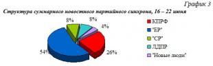 Что касается синхрона (прямой речи) партийцев, то его структура аналогична: единороссам досталось 54% новостного синхрона, либерал-демократам и «эсерам» по 8%, «Новым людям» 4%.