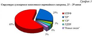 Что касается синхрона (прямой речи) партийцев, то его структура аналогична: единороссам досталось 65% новостного синхрона, либерал-демократам 4%, «Новым людям» и «эсерам» по 3%.