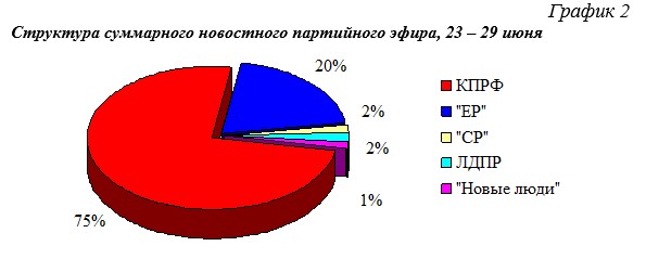 Таким образом, в период с 23 по 29 июня по сравнению с предыдущей неделей возросла доля КПРФ (с 32 до 75% эфира).