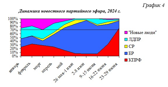 В течение 2024 г. структура новостного партийного телеэфира менялась следующим образом (Гр.4):