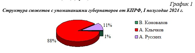 Таким образом, наибольшее число сообщений в период с 1 января по 30 июня 2024 года было посвящено А. Клычкову (73 сюжета или 88%). Второе по освещению место занял А. Русских (9 сюжетов или 11%). В. Коновалов упоминался в 1 сообщении (1%) (Гр. 1).