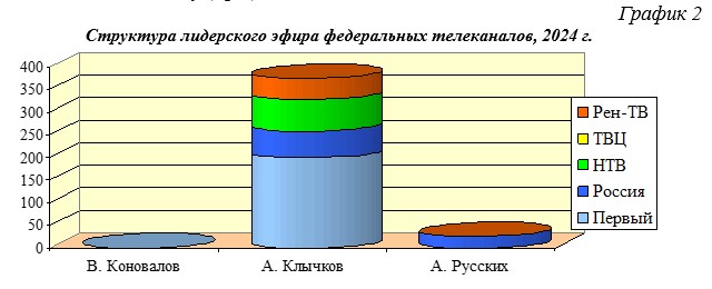 Рассмотрим на графике, как распределялось эфирное время В.Коновалова, А. Клычкова, А. Локотя и А. Русских на пяти ведущих телеканалах в 2024 году (Гр.2).