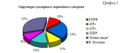 Что касается синхрона (прямой речи) партийцев, то его структура аналогична: наибольшую долю эфирного времени заняли слова В. Володина (32% или 6 минут 43 секунды синхрона). «Единороссам» было предоставлено 24% эфирного времени или 4 минуты 54 секунды синхрона.