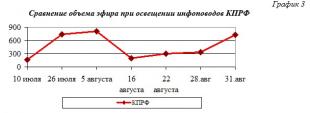 Таким образом, объём эфира, посвящённого празднику «Три Спаса», резко возрос в сравнении с последними инфоповодами КПРФ и практически достиг уровня освещения поездки Г. Зюганова в Орёл в начале месяца и отправки 127 Гумконвоя 26 июля (график 3).