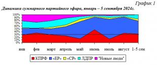 Рассмотрим динамику суммарного партийного эфира (в %) по месяцам с начала года (Табл. 1).