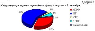 ЛДПР: Доля ЛДПР колебалась от 4% в июне до 25% в январе. Непосредственно перед выборами (с 1 по 5 сентября) либерал-демократы заняли 16% эфирного времени.