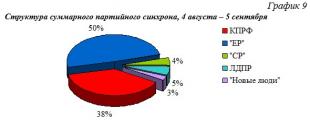 КПРФ: В период с января по сентябрь доля Компартии колебалась в промежутке от 15 до 47%. Наибольшую долю эфирного времени Компартия получила в июне (47%), наименьшую – в июле (14%). 4 месяца из восьми КПРФ обгоняла «ЕР» по объёму эфира (январь-март в период Президентской выборной кампании и июнь, когда отмечался юбилей Г. Зюганова). Перед днём голосования, как и в прошлом году, доля КПРФ сперва снизилась, затем резко возросла: так, в июле у партии было 14%, в августе 34%, в начале сентября – 32%